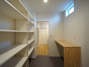 ユーティリティは一面を収納スペースに